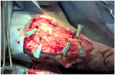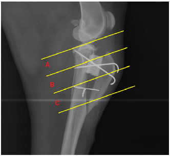 Se les administró morfina, 0,2-0,4 mg/kg/12 horas/3 días/SC y 20 mg/kg de cefalotina sódica/24 horas/2 días/IM, como analgésico y antibioticoterapia, respectivamente. Terminada la cirugía y durante 3 días se realizó vendaje desde la región tibial distal hasta la región diafisiaria del fémur. Se realizó curación diaria de la herida quirúrgica con solución salina al 0,9% hasta obtener cicatrización completa con retiro de puntos en el día 15. El retiro de los implantes ortopédicos se realizó a los 4 meses.