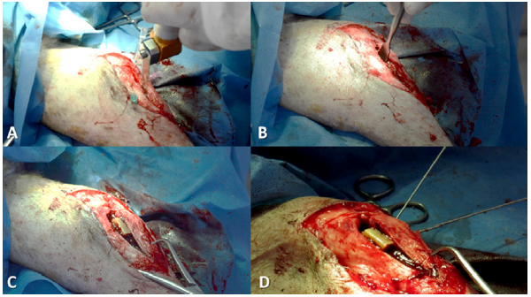 El corte de la cuña con las medidas para cada paciente se realizó durante el intraoperatorio con el empleo de sierra oscilante. Para la fijación de la cuña en el nuevo espacio interóseo, se utilizaron 2 clavos de osteosíntesis de punta roscada para hueso cortical entre 1,5 mm y 2 mm, que dependen del tamaño del paciente (figuras 6C y 6D). Estos se implantaron de forma cruzada con dirección al centro del heteroimplante (figura 7). La fijación se complementó con cerclaje de la tuberosidad con alambre ortopédico. La síntesis del tejido blando se realizó de manera rutinaria empleando, para ello, polyglactin 910 del calibre 3-0 como sutura interna y seda calibre 2-0 como sutura externa.