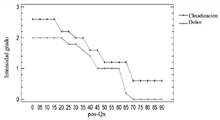 Cada miembro fue observado a la marcha durante 90 días posquirúrgicos con intervalos de observación de 5 días. Previo a la cirugía, el 60% de los pacientes tenían claudicación grado I y el 40% restante claudicación grado IV. Se puede decir, según la gráfica, que los pacientes hasta el día 15 posquirúrgico presentaron claudicación grado III, que desde el día 20 hasta el día 65 se mantuvo en grado II y que esta involucionó a grado I alrededor del día 70. Al final del periodo todos los animales presentaron apoyo normal del miembro tratado.