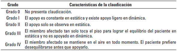 Claudicación en la marcha: se evaluó el grado de claudicación según la escala de valoración que se muestra en la tabla 1.