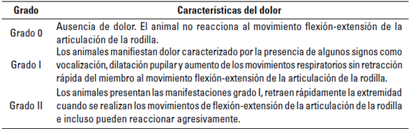 Los animales fueron evaluados cada 5 días por un periodo de 90 días, en el que se clasificó el grado de claudicación a la marcha y el dolor al movimiento de flexión-extensión de la articulación de la rodilla, según las tablas 1 y 2, respectivamente.