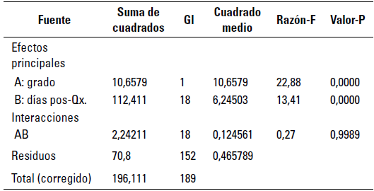Los resultados del experimento se analizaron con el software Statgraphics de la Universidad de Córdoba, Colombia. Según la tabla 4, Anova, los 2 valores-P menores que 0,05 tienen un efecto estadísticamente significativo sobre la intensidad del grado (claudicación y dolor), con un 95,0% de nivel de confianza.
