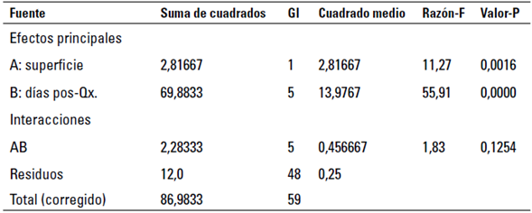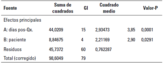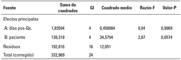 Para probar la significancia estadística de cada factor (pacientes y días posquirúr-gicos), se presenta la tabla Anova (tabla 5). Los valores-P prueban la significancia estadística de cada uno de los factores. Puesto que los 2 valores-P son menores que 0,05, estos factores tienen un efecto estadísticamente significativo.