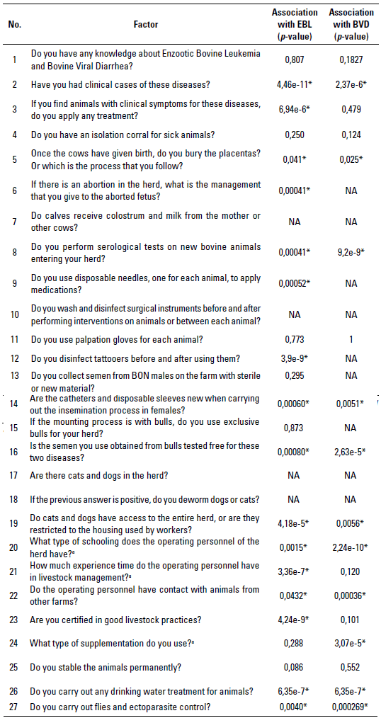 After each sampling per herd, a survey with 27 questions (table 1) involving 5 main axes was carried out to identify the factors associated with serological positivity to BVD and EBL. The 5 axes include: 1) knowledge of the diseases, 2) handling the material used for services, reproductive check-ups and surgical interventions, 3) management of other animal species that are maintained within the herd, 4) aspects regarding herd personnel and farm certification, and 5) nutritional and sanitary management of animals. All the surveys were digitized into spreadsheets with a rating of zero (0) when the answer to a question was negative, and one (1) when the answer to a question was positive. For the questions in which the answer did not lead to a "yes" or "no" answer (eg question no. 6 of the questionnaire), but which in turn yielded a dichotomous answer, categories of zero (0) and one (1) were similarly assigned. When there were more than 2 possible answers (for example, in questions no. 20, 21, and 24) a rating of zero (0), one (1) and two (2) was assigned to the three types of possible answers.