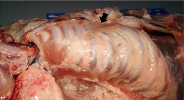 Os dois filhotes que morreram por complicações respiratórias estão relacionados à apresentação do pectus excavatum, associado à morte dos pacientes, como foi possível verificar na avaliação tanatológica do paciente avaliado pela unidade forense da Corporación Universitaria Remington, o pectus excavatum pode comprometer significativamente a função cardíaca e pulmonar, provocando a morte. Os efeitos pulmonares estão associados à doença pulmonar restritiva secundária, à diminuição da capacidade intratorácica ou à atelectasia pulmonar causada por compressão cardíaca, o que explica o quadro crônico de hipóxia devido à insuficiência ventilatória. A anormalidade na caixa torácica também produz distúrbios circulatórios que são explicados pela posição cardíaca anormal forçada que altera o caminho dos grandes vasos, afetando o retorno venoso. Além disso, a compressão da capacidade ventricular da massa cardíaca é reduzida e há uma diminuição no débito cardíaco, e algumas anormalidades cardíacas congênitas também podem estar presentes (Mestrinho et al. 2012; Molina-Díaz & Aguirre 2012). Um exame ecocardiográfico é recomendado em pacientes com sopro cardíaco, nos quais foi relatado que pode ocorrer um movimento discinético da parede torácica, que pode ser resultado do deslocamento dorsal do coração pelo desvio do externo (Goto et al. 2016).