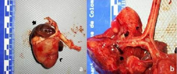 No exame interno, por meio de uma dissecção média ventral, observa-se uma fenda do peto esternal relacionada às esternas caudais próximas à cartilagem xifoide (figura 2), a porção ventral da caixa torácica é achatada. Ao avaliar o sistema respiratório, é encontrado conteúdo espumoso na cartilagem epiglótica da laringe e sinais graves de enfisema nos lobos caudal, craniano e pulmonar médio. No exame do sistema cardiovascular, no coração, há assimetria morfológica invaginante no septo interventricular na mesma área em que ocorre a fenda esternal. Átrio direito severamente congestivo e dilatado, igualando o tamanho do ventrículo direito, observa-se comunicação persistente do ducto arterioso; hemorragia equimótica na face laterais-esquerdas esquerdas do segmento médio na seção torácica da aorta, no sulco jugular, também podem ser observadas infiltrações hemorrágicas bilateralmente, com trauma por punção em ambas as veias jugulares. No nível abdominal, há alterações discretas com uma leve coleção serohemática livre; o fígado mostrou-se congestivo, de aparência marrom, sugestivo de congestão passiva; a vesícula biliar estava cheia de embebição biliar. No sistema linfohematopoiético, o timo era evidente com hemorragias petéquias difusas e o baço com zonas congestivas multifocais (figura 3).