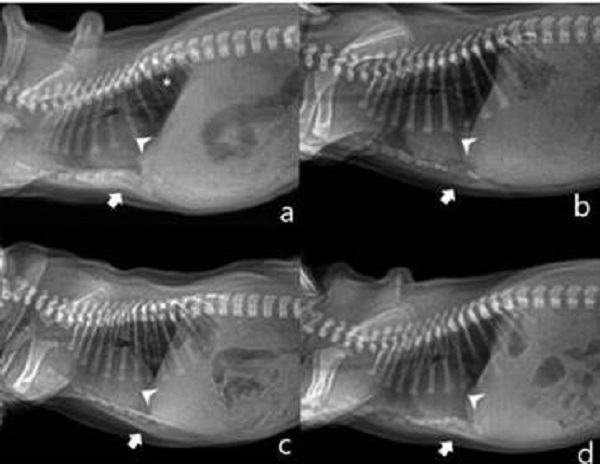 As vistas laterais dos quatro filhotes são feitas usando radiografia digital (generador VR 40 VET _RAY INC, USA, Idaho 1989). As imagens radiográficas mostraram uma depressão dorsal do terço caudal do esterno, com graus variados de gravidade, nos casos mais graves, foi observada uma silhueta cardíaca arredondada com deslocamento dorsal, acompanhada de deslocamento dorsal da silhueta traqueal em sua porção torácica (figura 4A y 4D). Em um dos casos, houve um aumento moderado da radiopacidade pulmonar (figura 4A).