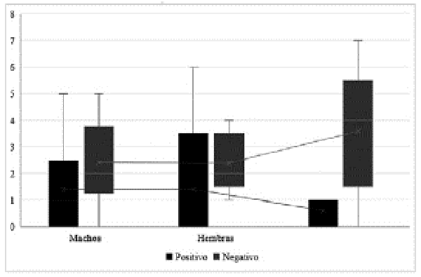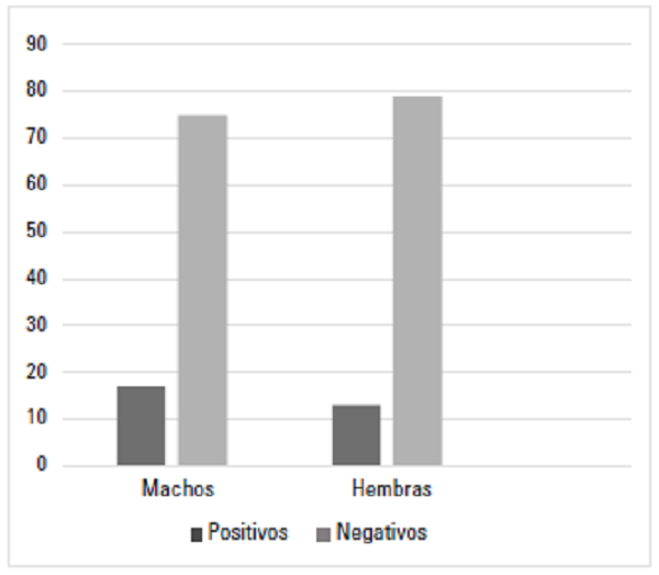 La frecuencia de felinos positivos fue 32,60% (30/92); la proporción según sexo mostró que los machos positivos representaron 18,47% (17/92), mientras que las hembras positivas 14,13% (13/92) (figura 1). No se encontró diferencia estadística significativa para la relación entre seropositividad y sexo p > 0,05 (figura 2). En cuanto a la edad promedio de positividad fue de 2,14 ± 0,5 años. No se pudo determinar diferencia estadística para la edad, entre gatos positivos y negativos (p > 0,05).