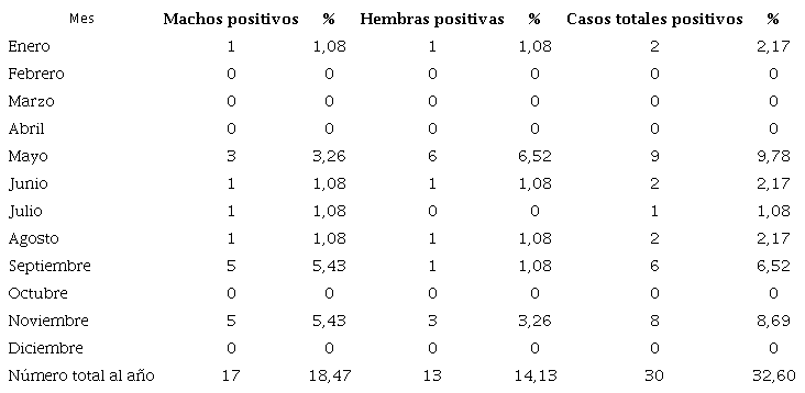En cuanto a la frecuencia de la enfermedad por meses, se describe que los meses que presentaron mayor casuística fueron mayo, con 9 casos (9,78%); noviembre, 8 (8,69%); y septiembre, con 6 (6,52%) (ver tabla 1).