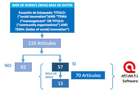 Se efectuó en cinco pasos. El primero fue construir la ecuación de búsqueda y aplicarla a la base de datos de Web of Science™ con palabras clave como "innovación social" en el campo "Título" AND "gestión" en el campo "Tema" OR "organizaciones comunitarias" en el campo "Título" AND "Índice de innovación social" en el campo "Tema"; se incluyeron todos los años disponibles (2003-2020 / septiembre) en todos los idiomas y como producto de esta ecuación de búsqueda se obtuvo un total de 119 documentos. El segundo paso consistió en analizar los 119 documentos a través del software de minería de datos VOSviewer™. En el tercer paso, se revisó la correlación entre los campos de estudio, la relevancia de las publicaciones entre países y la dinámica de publicaciones en el tiempo. En el cuarto paso, se realizó la lectura de los títulos y resúmenes de los 57 documentos priorizados en la búsqueda para cumplir el análisis de pertinencia a la investigación. Y para el quinto paso, se realizó lectura y codificación de 70 documentos que incluían 13 obtenidos por el método de bola de nieve usando el software de análisis cualitativo ATLAS.ti™ (figura 1).