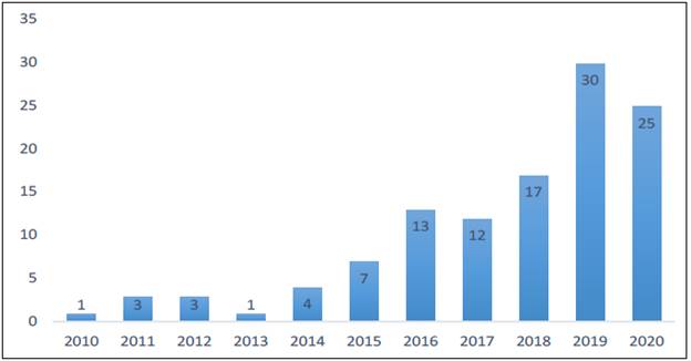 Como se observa en la figura 2, el número de publicaciones sobre innovación social presenta una tendencia creciente en los últimos cinco años, lo cual evidencia el interés actual de la comunidad científica en este campo de estudio.