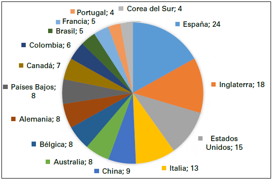 En cuanto a la dinámica de publicaciones por país, como se observa en la figura 3, España e Inglaterra ocupan los primeros lugares con 24 y 18 publicaciones, respectivamente. Los estudios se centran en la conceptualización de la innovación social, el análisis de experiencias para futuras líneas de investigación y el papel de diferentes actores en la gestión de innovación social (Batle et al. 2018; Edwards-Schachter y Wallace 2017).