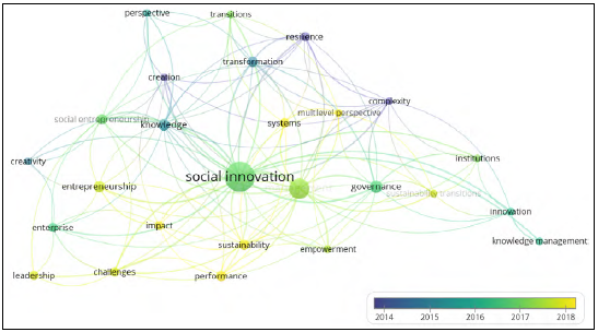 Finalmente, mediante el software VOSviewer™, se analizó la relación entre palabras clave con una concurrencia de tres por documento. De acuerdo con este análisis, y como se puede evidenciar en la figura 4, la innovación social es un campo de estudio que se relaciona directamente con la gestión, el emprendimiento y el emprendimiento social, la gobernanza, el conocimiento y los sistemas, que se complementa según los intereses de los investigadores, sin desconocer, por una parte, que la innovación social beneficia directamente a las personas y, por otra, que el concepto aplicado a las organizaciones puede variar de acuerdo con el tipo de organización. Asimismo, en un plano más contemporáneo, se habla de empoderamiento, sostenibilidad, actuación, impactos, retos, liderazgo y creatividad (Santamaría Ramos y Madariaga Orozco 2019).