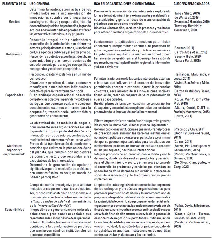 De acuerdo con los resultados generados por el software de minería de datos VOS-viewer™, se identificaron palabras clave con mayor relevancia para el tema de estudio y a través de análisis cualitativo se identificaron los elementos propios de innovación social (gestión, gobernanza, capacidades, modelo de negocio y sostenibilidad). A continuación, se presenta en síntesis el análisis de cada elemento identificado (tabla 1).