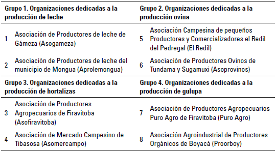 A través de la base de datos publicada en la página del Instituto Colombiano de Bienestar Familiar (ICBF) en la sección "Estrategia de compras locales", se obtuvieron los datos generales de 24 asociaciones de productores agropecuarios ubicadas en la provincia del Sugamuxi (ICBF 2020); se escogió la anterior en atención a la definición de las necesidades de demanda tecnológica del departamento soportadas por el portal institucional Siembra, ya que esta base de datos es la más robusta y actualizada. A continuación, se realizó filtrado para seleccionar las organizaciones por tipo de producto, teniendo en cuenta la priorización de los encadenamientos productivos del departamento de Boyacá y la plataforma tecnológica de ciencia, tecnologia e innovación del sector agropecuario colombiano (https://Siembra.gov.co), donde se evidenciaron demandas tecnológicas por atender, lo que arrojó como resultado cuatro grupos. 1. productores de leche, 2. productores de ovinos, 3. productores de hortalizas y 4. productores de frutales.
