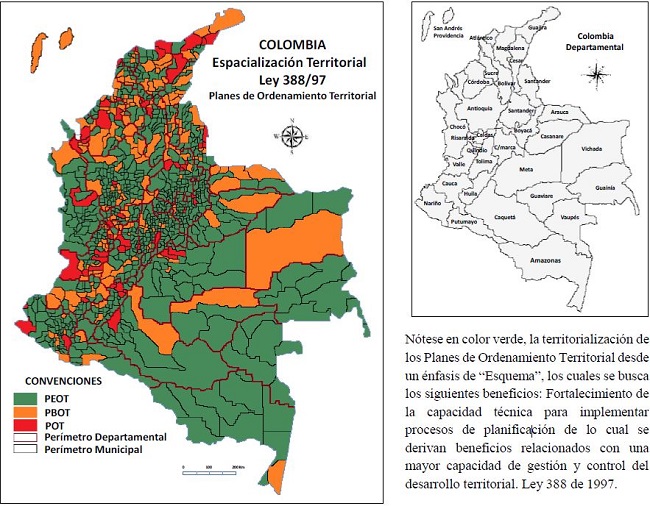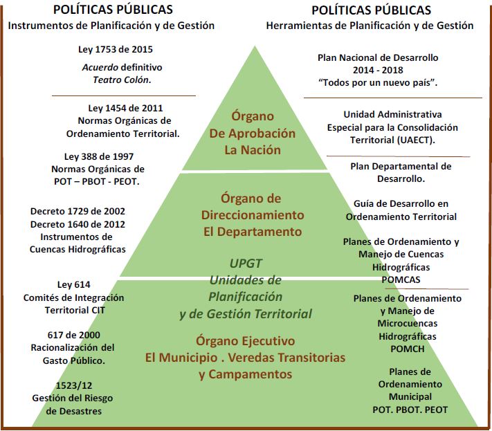 Colombia desde más de cinco décadas ha estado inmersa en un conflicto interno entre dos actores Guerrilla y Estado; lo cual, ha derivado en periodos de violencia continúa incorporándose otros actores como el paramilitarismo en asocio con sectores productivos y en asocio con el Estado en su conformación y mantenimiento, interrelacionándose factores como el narcotráfico. Lo insólito en los respectivos periodos, es la formulación y aprobación de distintos Planes de Desarrollo en contextos geográficos variados como el Nacional (PDN), Departamental (PDD), y Municipal (PDM), también recientemente la puesta en marcha de los Planes de Ordenamiento Territorial de iniciativa Municipalista conocidos como los POTs, a través de la Ley 388 de 1997; además, paralelamente se han desarrollado los Planes de Manejo de Cuencas Hidrográficas conocidos con el nombre de POMCAS, basados a través de los Decretos 1729 de 2002 y 1640 de 2012 elevados a Iinstrumentos para la Planificación, Oordenación ambiental del territorio desde un nivel regional en coordinación con las Corporaciones Autónomas Regionales CARs. Véase Grafica No 1. Jerarquía de los instrumentos y herramienta de gestión y planificación. En el contexto nacional, sobresalen los Planes Esquema de Ordenamiento Territorial (PEOT), que son determinados por el número de concentración poblacional en el nivel local. Véase Figura No 1. Espacialización Territorial de la Incidencia de la Ley 388 de 1997