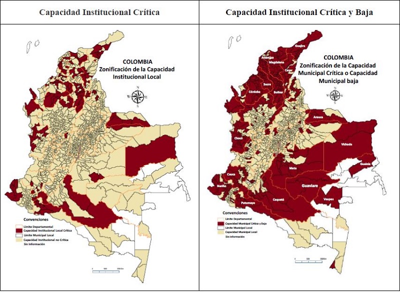 Datos de recaudo tributario con lo que se puede medir la capacidad institucional entre los periodos 1970 y 2015 estudio citado (López, C. 2016) Colombia pasó de un recaudo tributario del 8% del PIB a uno del 14% del PIB, por debajo de países como Brasil que llegaron al 35%. Esto es determinante en la prestación de servicios sociales básicos, lo cual ha identificado al estado dentro del asistencialismo. El punto central del proceso de paz es lograr tener territorios institucionalizados como estrategia de la política pública dentro de la transición de ese poder complejo y efectivo ejercido por ciertos actores en el territorio. La construcción de Estado a nivel local se identifica a lo largo de las mismas Constitución Política de 1991 y de las mismas leyes como es la 1454 (LOOT), que fortalece un gran número de asociatividades territoriales con el fin de fortalecer la descentralización administrativa y territorial, creando municipios y departamentos fuertes en un proceso que resulta de pasar de un extremo a otro que resulta de combinar esfuerzos e iniciativas y nuevos poderes institucionales como sociales y económicos.
