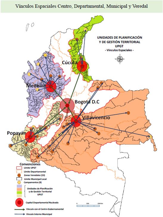 El siguiente paso, es el de áreas de concentración referente a territorios denominados de paz, nos ha llevado al reconocimiento e implementación de herramientas de gestión y de planificación territorial, las cuales, utilizadas de tal forma que se puedan articular entre municipios veredas, estas entre departamentos y a la ves con las directrices creadas por el Estado Colombiano como la Unidad Administrativa Especial para la Consolidación Territorial (UAECT - Sede Central la Ciudad de Bogotá D.C.); lo que obliga la articulación de políticas públicas enmarcadas en la ejecución de programas y proyectos nacionales, departamentales y municipales entre sí, además de recursos de financiación internacional. Finalmente, el siguiente paso, es el de articular los vínculos espaciales de las ciudades capitales de las regiones conformadas a través de la asociatividad departamental e integradas por las UPGT. Véase figura No 4. Espacialización del modelo espacial para la evaluación y gestión del territorio para la incorporación de las UPGT al pos-conflicto colombiano.