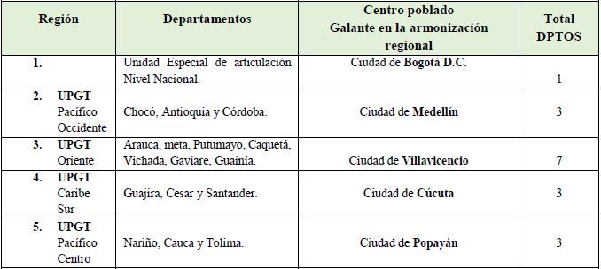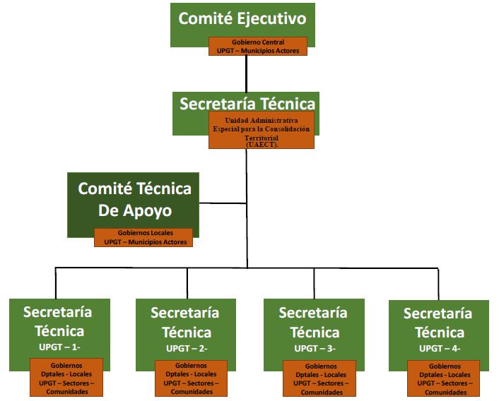 Finalmente, el proceso de paz para una paz duradera se necesita darle continuidad a los procesos gubernamentales representados por los propios actores que han de conformar los nuevos territorios y democráticamente establecer desde el gobierno nacional las reglas claras en la ocupación de los nuevos territorios. Se Conforman tres órganos responsables: Primero el Órgano de aprobación de los distintos programas y proyectos de inversión en infraestructura que se implementarán en los tiempos programados para su puesta en marcha y posterior ejecución y seguimiento. Segundo el Órgano de Direccionamiento que define la vinculación o participación política de líderes y lideresas de la comunidad localizadas en cada una de las cuatro Regiones UPGT. Y Tercero el Órgano Ejecutivo, encargado de la administración y gestión conjunta de las cuatro (UPGT), con el centro del país (Ciudad de Bogotá D.C. Presidencia de la república) para asegurar la legitimidad, apropiación, internalización y corresponsabilidad en la implementación y ejecución de las Regiones UPGT. Las cuales deben contar con las siguientes características fundamentales: liderazgo, nivel de institucionalidad y Administración de gestión territorial, capacidad analística y sentido de pertenencia con los territorios y con las instituciones que las conforman.