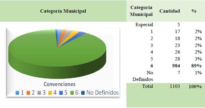 Según la Tabla No 1., cerca del 89% de los municipios de Colombia se encuentran en sexta categoría, lo que quiere decir que son territorios con poca capacidad fiscal al recibir menos recursos del Estado, haciendo que su dependencia de la nación sea mayor ya que: Poseen menor capacidad de generar ingresos propios y consecuentemente presentan escapes presupuestales para emprender iniciativas propias de política pública e inversión. Esto obliga a seguir pensando y estudiando lo local, como célula fundamental del funcionamiento de Colombia en sus modos de gestión, y galantes del nuevo proceso de vinculación de actores que hoy están denominados como Sociedad Civil y con la potestad y experiencia de jalonar los nuevos procesos de desarrollo y crecimiento económico en territorios municipales de periferia con granes potencialidades ambientales pero aislados por la falta de infraestructura física como de equipamientos sociales.