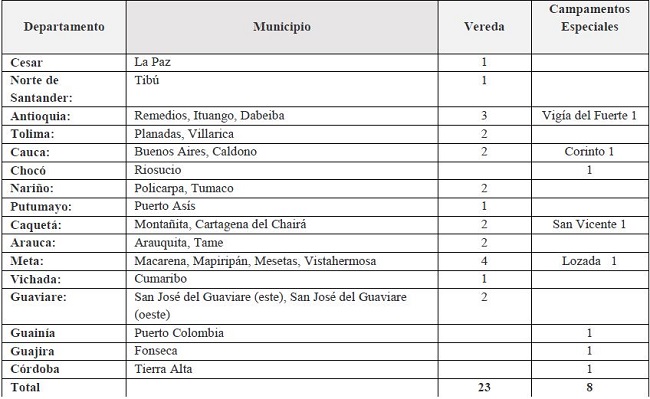 La investigación se desarrolla en el contexto Veredal como instancia articuladora del territorio municipal, inmersos en quince (15), departamentos del contexto de la nación donde se identificaron ocho (8) campamentos y veinte tres (23) Zonas Veredales como disposición de los diálogos del Gobierno Nacional (Habana Cuba), en asocio con las FARC EP, en los diálogos de la Paz, mostradas en la Figura No 3 Espacialización Zonas de Normalización Transitorias. Estas zonas abarcan en términos departamentales el 46% del territorio nacional distribuidos en los departamentos de: Guajira, Antioquia, Córdoba, Chocó, Norte de Santander, Cesar; Huila, Cauca, Nariño, Putumayo, Caquetá, Meta, Vichada, Guaviare, Guainía y Arauca. Véase la tabla No 2.