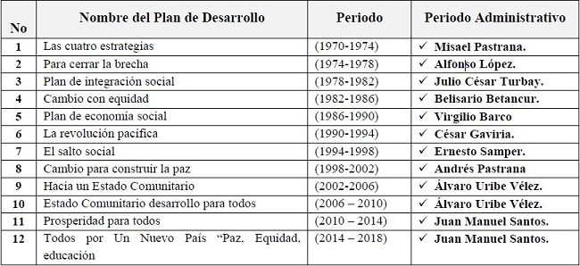 Considerado el Plan de Desarrollo como la herramienta formal y legal por medio de la cual, se trazan los objetivos de gobierno, permitiendo la evaluación de su gestión, esta es la herramienta que sirve de base y provee de lineamientos estratégicos de las políticas públicas formuladas, se socialicen, evalúen, se realice el seguimiento. A continuación se muestran por periodos administrativos los pilares de desarrollo y crecimiento que se planificaban a lo largo de todo el territorio nacional y que siguen enunciando sin ser representativos a lo largo del territorio nacional y que deberían ser hoy de una Colombia totalmente distinta que pudiera representarse en país con indicadores altísimos de calidad y oferta de infraestructura social teniendo a Colombia en los más altos estándares de calidad.
