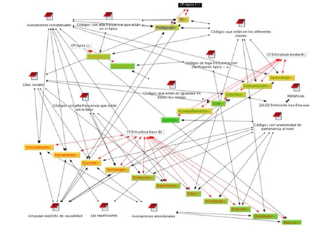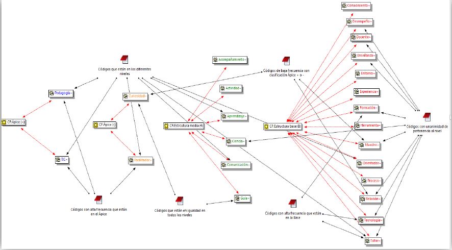 Posteriormente, los códigos son agrupados en familias acordes a patrones de relación (orden de aparición en las jerarquías), los cuales organizan los más importantes (Ápice superior e inferior) hasta los que menos son reconocidos en la cadena de términos inductores (Estructura media y base). Por último, se utilizan los memorandos para interpretar por medio de la codificación axial (Strauss y Corbin, 2002), el conjunto de códigos y sus respectivas citas que aparecen en diferentes agrupamientos en aras de dimensionar y reestructurar la red semántica que se desarrolló en el software Atlas ti. A continuación, se muestran los resultados en función de las etapas ya mencionadas, hasta la presentación de la red semántica que organiza la jerarquía de los términos inductores.