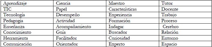 De igual manera acontece con palabras como actividad, bases de datos, tecnologías, docente, entre otras que se utilizan para dar a conocer características de los docentes y el quehacer en modalidades b- learning. Estas repeticiones se recrean indistintamente de la evocación generada por la pregunta, la cual peude referir directamente al docente y su rol, así como a medios de comunicación que utiliza para informarse, expresar relaciones entre pedagogía y TIC o experiencias y actitudes sobre el rol profesional llevado a cabo dentro de la UMNG.