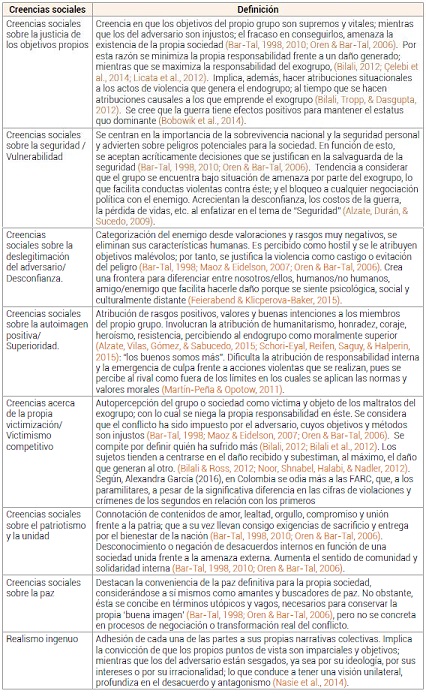 Es decir, se configuran creencias sociales y un entramado de procesos cognitivos, que movilizan prácticas y comportamientos coherentes a dichos intereses, los cuales consiguen fortalecer esta cultura bélica, permeando la vida cotidiana y su transmisión de generación en generación (Arias & Barreto, 2009; Bar-Tal, 2010). Para Bar-Tal (1998), estas creencias designan cogniciones compartidas por los miembros de una sociedad en relación a temas de especial interés para la misma. Resultan de procesos y dinámicas sociales y políticas que cubren diferentes ámbitos de la vida social. Varían en función de su objeto y contenido, pudiendo referirse a los objetivos de una sociedad, a su autoimagen, sus instituciones, etc. Son compartidas por una gran parte de los miembros de una sociedad, desempeñan un papel fundamental en la toma de decisiones y en los cursos de acción que siguen los sujetos; además, sirven a los líderes económicos, políticos y sociales para justificar sus decisiones y acciones pasadas, presentes o futuras. Son impartidas por las instituciones sociales, a través de los procesos de socialización e incorporan los estereotipos y los mitos que habitan la cultura (Bar-Tal, 1998; Oren & Bar-Tal, 2006). Finalmente, justifican y legitiman las acciones del endogrupo, negando su responsabilidad u otorgándole argumentos que sustenten su negativa a la resolución, la reconstrucción y la reconciliación (Çelebi et al., 2014). Acto seguido se exponen algunas, que han sido desarrolladas en diversas investigaciones: