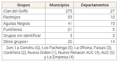 Así mismo, existe una variación de las causas políticas en la formación del Clan Golfo con respecto a las AUC, las estructurales perviven, como la debilidad estatal para desempeñar su rol en la garantía de la seguridad y control social, razón por la cual, el Clan del Golfo tiene presencia nacional. (Ver mapa).