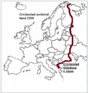 En Europa, línea de fractura más importante se ubica, en la frontera oriental de la Cristiandad Occidental del año 1500, la cual