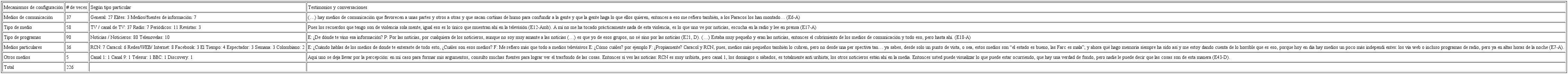 Sin embargo, se nos impuso, en el mismo proceso, realizar este análisis puesto que cada vez que se preguntó en las entrevistas por el origen de estas barreras psicosociales y por las creencias, emociones y recuerdos en torno al conflicto armado y sus actores, emergió inmediatamente la respuesta. En 226 ocasiones los participantes refieren de manera directa o indirecta que han construido estos mecanismos sociopsicológicos por el uso de medios de comunicación. Aún siendo 44 los participantes, este número de referencias a medios informativos, se produce porque en relación con el conflicto y cada uno de sus actores, se preguntó por la fuente u origen de la creencia, emoción o narrativa del pasado, tal como se desglosa en la siguiente tabla: