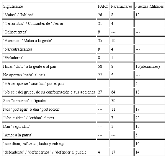 La Tabla No.3 se centrará, finalmente, en las respuestas de los participantes frente a preguntas sobre las emociones y representaciones cognitivas que suscitan en ellos la mención de dichos grupos y la calificación de estos en clave comparativa (específicamente ante las preguntas ¿Cuál de ellos le parece peor? ¿Son diferentes?). Lo que se refleja es la sedimentación de unas creencias sociales, unas narrativas sobre estos grupos y unas orientaciones emocionales colectivas que implica la justificación de unos actos sobre otros, la existencia y operatividad de unos grupos armados y de otros no, que construyen unos discursos encarnados que impiden ver como una posibilidad la salida negociada al conflicto armado. Finalmente, en relación con los medios de comunicación, se resaltan también tres significantes: en primer lugar, ser la fuente de información única en torno al conflicto y sus actores; en segundo lugar, la atribución de mayor daño, mayor responsabilidad y maldad a las FARC y menor o casi ninguno a las Fuerzas Militares. Y, finalmente, algunas emociones que movilizan y despiertan, aunque este punto se abordó con mayor claridad en la primera parte de estos resultados.