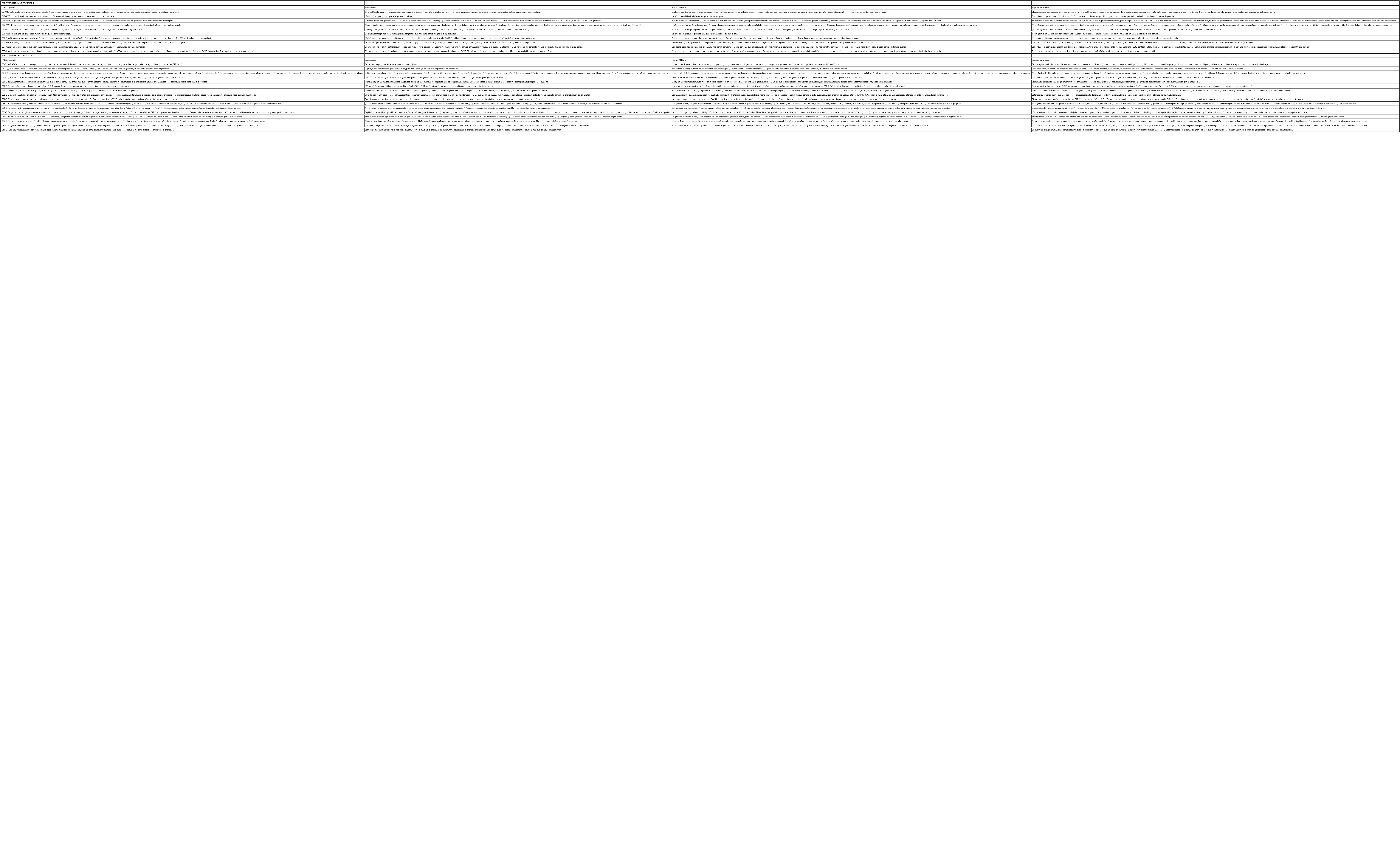 Ambas matrices deben orientarse por las siguientes claves de interpretación, a través de una clasificación de los significantes/significados más comunes, repetidos en los discursos de los participantes. Es decir, calificativos, formas de nombrar y referirse tanto a los actores armados del conflicto (FARC-EP, Paramilitares y Fuerzas Armadas), como de su objetivo, razón de origen y acciones bélicas. En relación con las FARC se resaltan tres grandes órdenes de significado. Especialmente y, en primer lugar, aquéllos que denotan su maldad absoluta, su incapacidad para transformarse, sus malas intenciones, sus acciones criminales, el dolor que han causado al país, lo que les constituye en el enemigo absoluto, dentro del marco polarizador construido. En la matriz completa se les tilda de malos o se les atribuye maldad, en detrimento de los otros actores. En segundo lugar, aquéllos que les atribuyen el calificativo de ‘terroristas’ o causantes de terror, ‘delincuentes’, ‘asesinos’ que ‘matan’ la gente, ‘narcotraficantes’, ‘violadores’ y otras denominaciones que constituyen un lugar identitario que no posibilita ninguna lectura alternativa ni la posibilidad de transformación, puesto que solo serían merecedores de justicia o venganza.