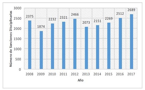 Antes de presentar la gráfica sobre el aumento de las sanciones disciplinarias, es menester indicar que desafortunadamente se cuenta con información limitada, pues los datos obtenidos solo abarcan desde el año 2008 hasta el 2017, información proporcionada por la Procuraduría General de la Nación, a través de la oficina de Sistema de Información de Registro de Sanciones y Causas de Inhabilidad, en adelante SIRI, y recogida por el Observatorio de Transparencia y Anticorrupción, por medio de su Indicador de sanciones disciplinarias. Pese a lo anterior, esta información nos permite evidenciar tendencias y datos globales que soporten los argumentos expuestos.