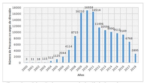 Uno de los principales hallazgos de esta investigación, se encuentra en la falta de correspondencia entre el aumento de sanciones de 2013 en adelante evidente en la Gráfica 1, y la disminución del número de investigaciones disciplinarias a funcionarios que tienen cargos de dirección en las distintas entidades del Estado, esto implica que el incremento de las sanciones solo parece aplicar a funcionarios que no tienen cargos de dirección, es decir quienes no toman las decisiones trascendentales al interior de las entidades, pues como se muestra en la siguiente gráfica, el número de procesos disciplinarios ha caído en los cargos de dirección.