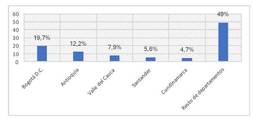 El escenario es distinto si el análisis se realiza a nivel de departamentos, en la medida en que se puede ver una tendencia, con excepción de Atlántico con Barranquilla, en cuanto a los lugares con más funcionarios públicos y más sanciones disciplinarias, por lo menos en las tres ciudades más grandes de país. Bogotá aporta el 19.7% de las sanciones, un total de 4.290 casos, Antioquia el 12.2% con 2.649 sanciones, Valle del Cauca el 7.9% con 1.727, después está Santander con el 5.6% con 1.220 y Cundinamarca un 4.7% con 1.031; en estos departamentos se han impuesto el 50.1% sanciones disciplinarias por temas de corrupción, para un total de 10.917 sanciones disciplinarias.