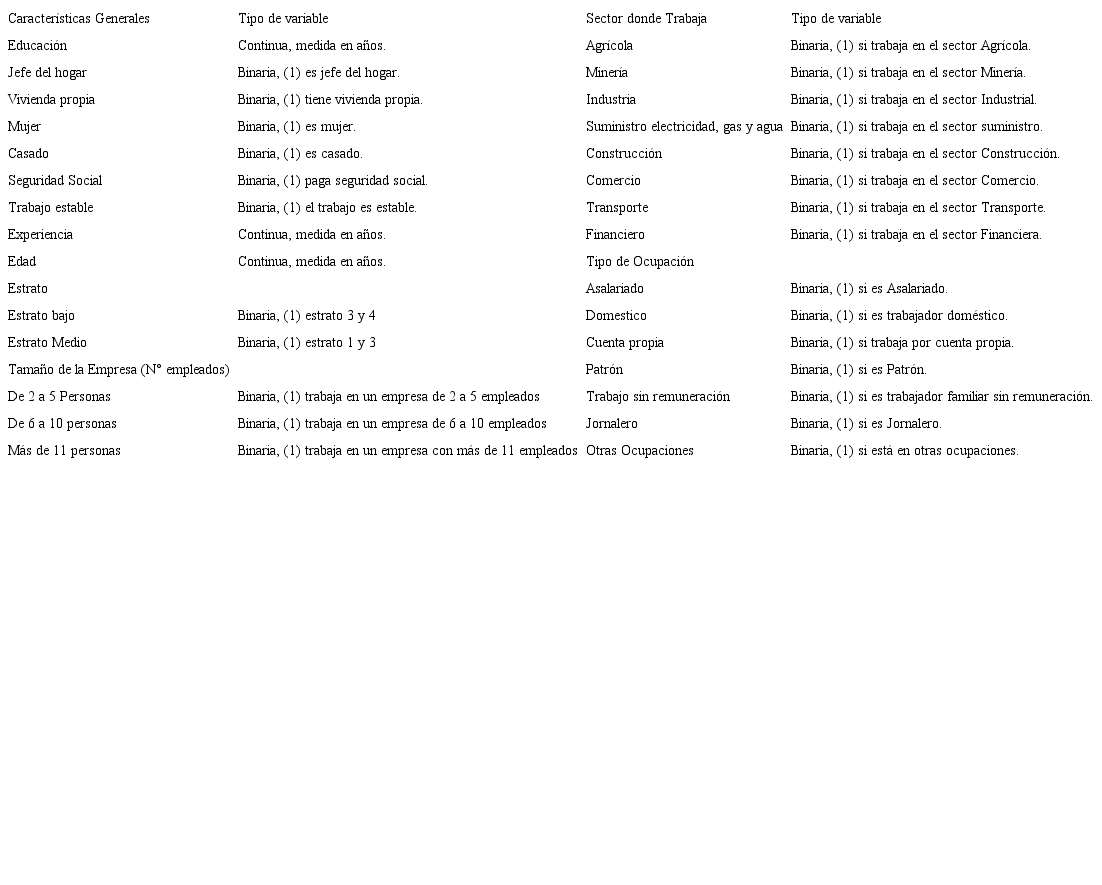 La variable dependiente esta representada por una variable binaria que toma dos valores, (1) sí el individuo manifiesta ser subempleado, y (0) sí está conforme con la actividad laboral que desarrolla. La siguiente tabla muestra el listado de variables independientes o explicativas que se tuvieron en cuenta en la estimación del modelo Probit.