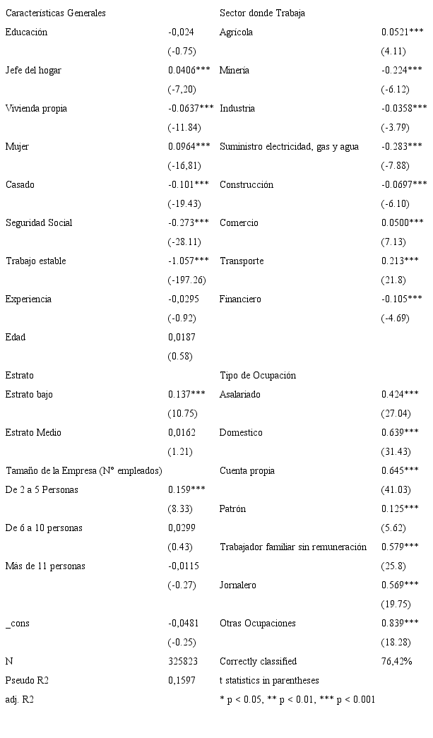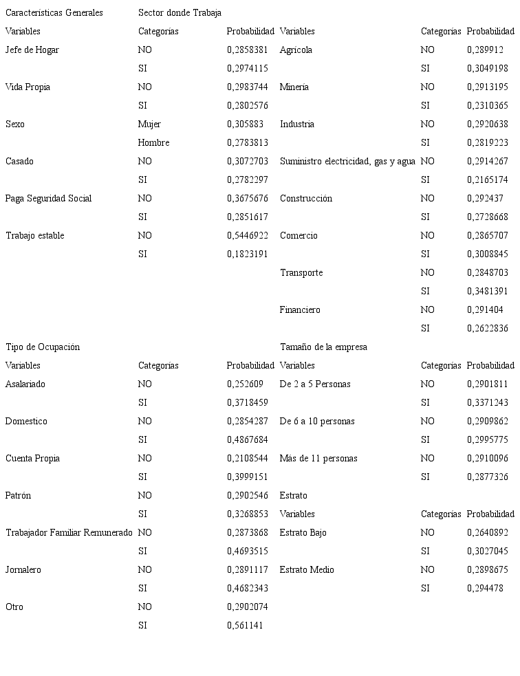 Con respecto a la posición ocupacional en el empleo actual, los obreros o empleados de empresas particulares, los empleados domésticos, los trabajadores por cuenta propia, los patrones o empleadores, los trabajadores familiares sin remuneración y los jornaleros, presentan una mayor probabilidad de caer en el subempleo que los trabajadores del gobierno. En cuanto a las ramas de actividad económica, los trabajadores del sector de la explotación de minas y canteras, las industrias manufactureras, el suministro de electricidad, gas y agua, la construcción y la intermediación financiera, presentan una menor probabilidad de ser subempleados que los trabajadores del sector servicios, mientras que en el sector de la agricultura, ganadería, piscicultura caza y silvicultura, comercio, hoteles y restaurantes y el de transporte, almacenamiento y comunicaciones, la probabilidad es mayor.