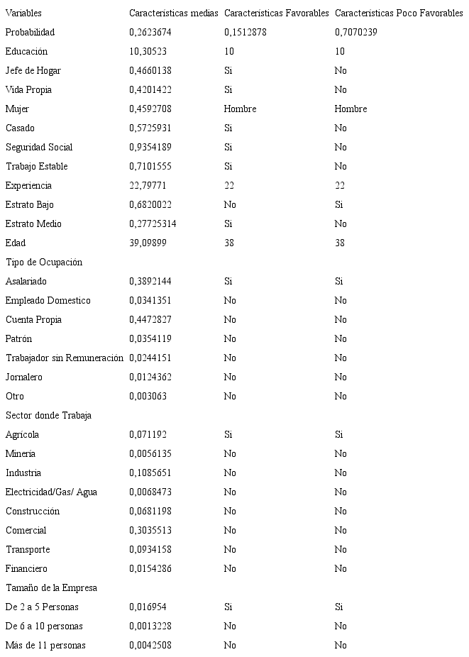 Al comparar dos individuos totalmente diferentes en sus características, es interesante observar como varía la probabilidad de ser subempleado; por ejemplo, un individuo con características favorables presenta una probabilidad del 15.12% de caer en el subempleo, mientras que un individuo con características poco favorables presenta una probabilidad casi 5 veces mayor (70.70%) de ser subempleado (ver Tabla 3). De esta forma se pueden evaluar un gran número de combinaciones de características de las variables para determinar las probabilidades de caer en el subempleo.