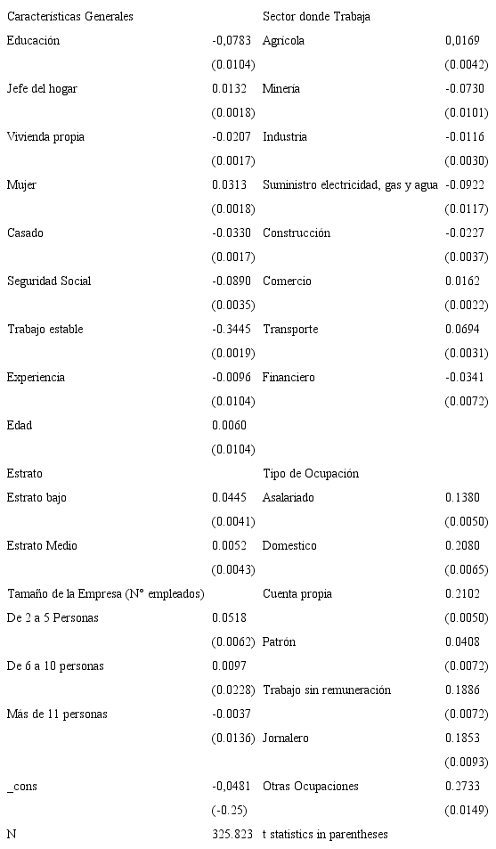 La educación y la experiencia laboral se relacionan de manera negativa con la variable dependiente, es decir, a mayor educación y experiencia laboral, menor es la probabilidad de ser subempleado, mientras que con la edad, la relación es inversa, a mayor edad, mayor es la probabilidad de ser subempleado; los individuos casados, los que cuentan con vivienda propia, los que pagan seguridad social y los que disponen de un trabajo estable, también presentan una menor probabilidad de caer en el subempleo. La experiencia laboral se estimó teniendo en cuenta la experiencia potencial: edad, menos el número de años de educación, menos seis (que corresponde a los seis primeros años de vida del individuo en donde aún no ha ingresado al Sistema Formal de Educación Nacional).