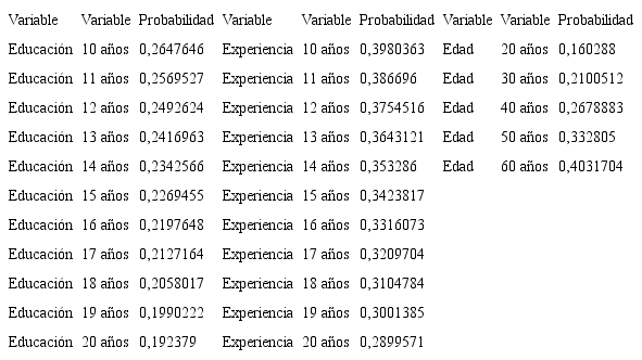 Variables como la educación, la experiencia y la edad, se pueden analizar marginalmente de manera más detallada por la unidad de medida, todas están expresadas en años. En el caso de la educación y la experiencia, la Tabla 5, muestra la probabilidad de caer en el subempleo para cada uno de los años que van desde los 10 años (de educación y experiencia) hasta los 20 años. En el caso de la edad, la distribución de la probabilidad se estima desde los 20 años, cada diez años, hasta los 60 años.
