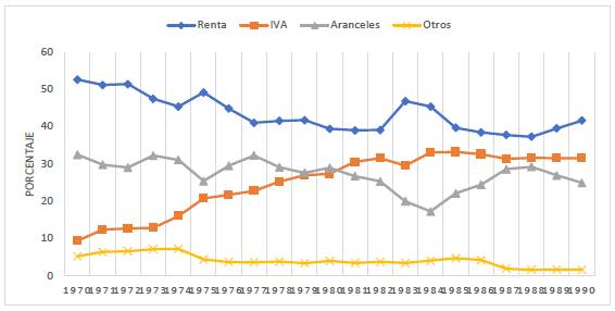 Como se observa en la anterior gráfica, la opresión fiscal se desplazó desde los impuestos arancelarios y de renta hacia el Impuesto a las Ventas, con el objeto de mantener la dinámica de promoción de exportaciones, generando un proceso que se ha perpetuado en nuestro régimen fiscal, y es la transferencia de la opresión fiscal desde los impuestos directos y progresivos hacia los impuestos indirectos y regresivos como es el caso del Impuesto a las ventas más adelante conocido como Impuesto al Valor Agregado.