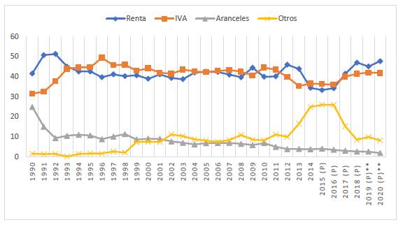 En la anterior gráfica se muestra el desenvolvimiento de los ingresos tributarios en Colombia entre 1990 y 2020, el impuesto a los aranceles pasó de tener una participación del 25% en el año 1990 a rondar el 2% parcial para el año 2020, atestiguando un desplome de 23 puntos porcentuales; mientras, que el impuesto del IVA pasó de 32% a 42% en el mismo periodo de tiempo, constatando un aumento de 10 puntos porcentuales en la participación de los ingresos tributarios en el país.