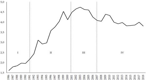 Así mismo, la apertura económica transitó desde la Industrialización por Sustitución de Importaciones hacia la política de promoción de exportaciones; apertura en la que se atestiguó un desplome posterior de los aranceles y una transferencia parcial del sistema impositivo desde el capital hacia la población.