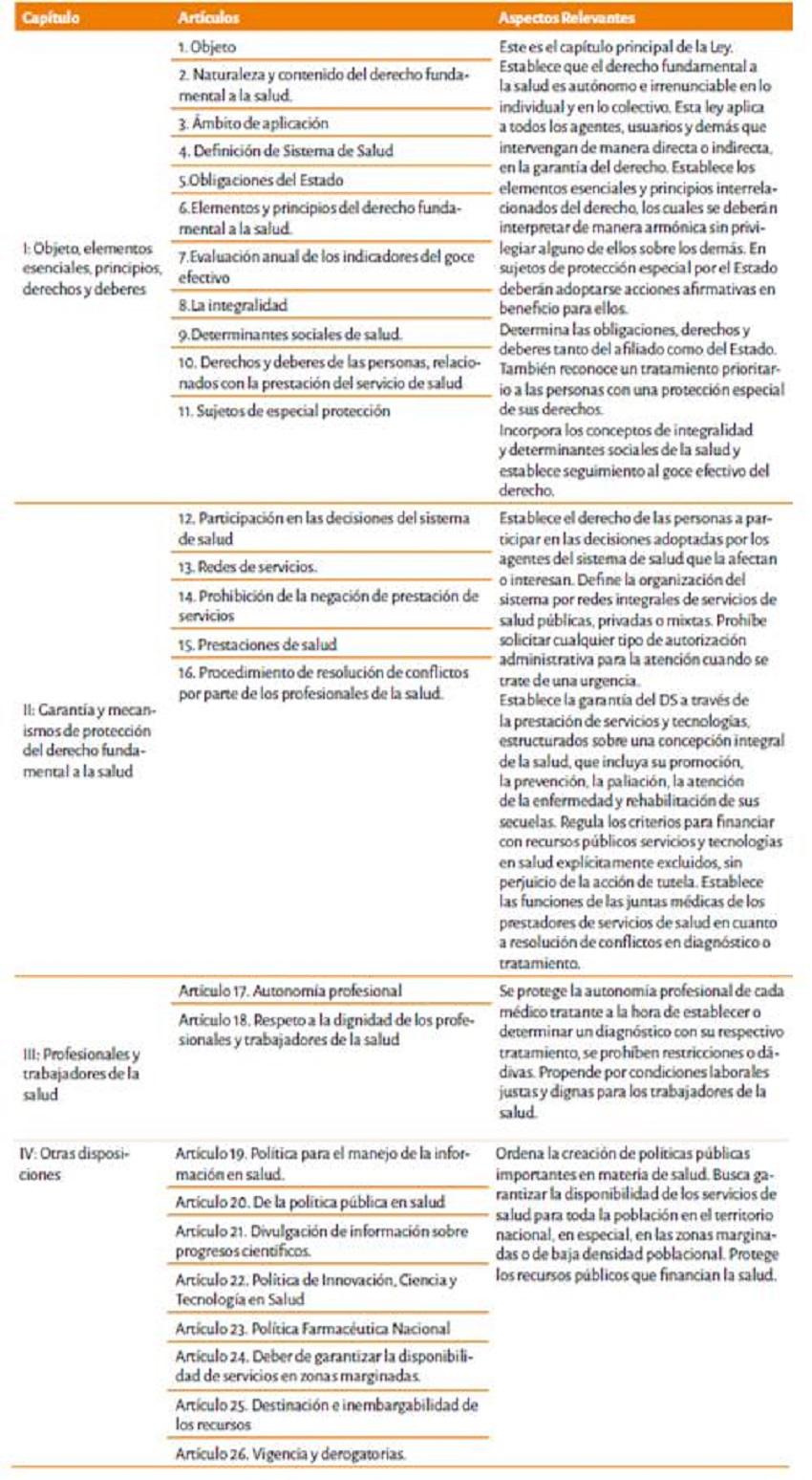 Las leyes estatutarias desarrollan los textos constitucionales que reconocen y garantizan los derechos fundamentales. (Jimenez et al., 2016) La Constitución Política de Colombia en su Artículo 152 enuncia que, mediante las leyes estatutarias, el Congreso de la República puede regular entre otras materias, los derechos y deberes fundamentales de las personas y los procedimientos y recursos para su protección.(Asamblea Nacional Constituyente, 1991) De acuerdo a lo anterior, la LES, tiene como Objeto: Artículo 1.“Garantizar el derecho fundamental a la salud, regularlo y establecer sus mecanismos de protección”.(Congreso de la República de Colombia, 2015).