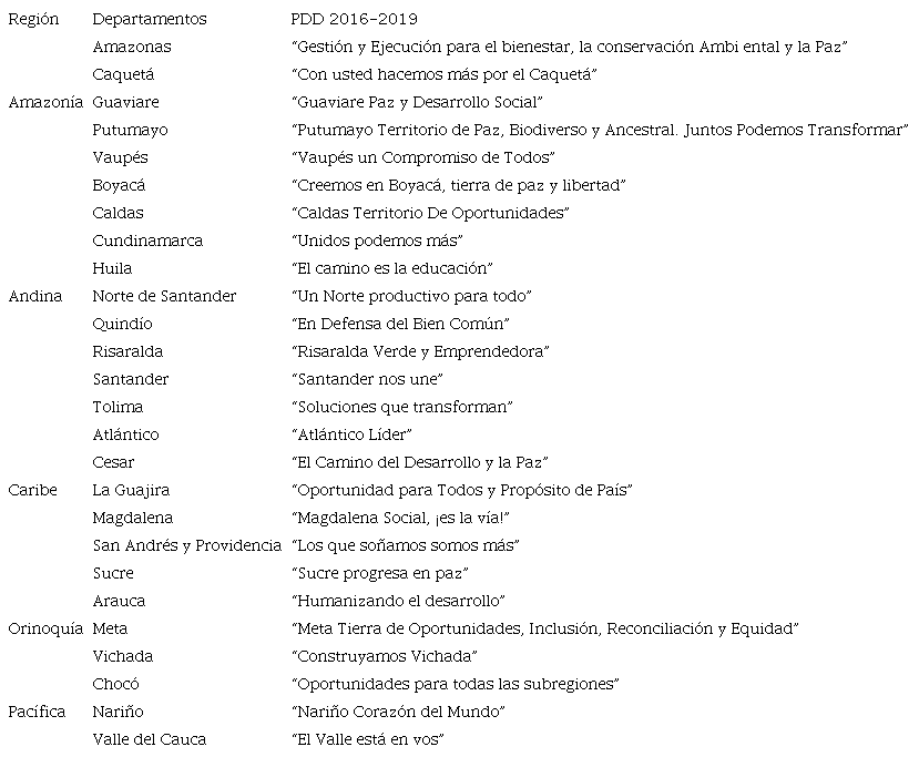 Se resalta también, la articulación de PDD específicos con otras iniciativas globales como: El PDD de Nariño que reconoce los postulados del Decenio Internacional 2015-2024 para los Afrodescendientes. El Decenio Afro constituye un marco de las Naciones Unidas y una base sólida para la lucha contra el racismo, la discriminación racial, la xenofobia y las formas conexas de intolerancia. (Gobernación de Nariño, 2016) Así como Arauca y Santander, que adoptaron, en la formulación de sus PDD, el enfoque de Crecimiento Verde de la Organización para la Cooperación y el Desarrollo Económico (OCDE) como parte de su marco estratégico. (Gobernación de Arauca, 2016; Gobernación de Santander, 2016).