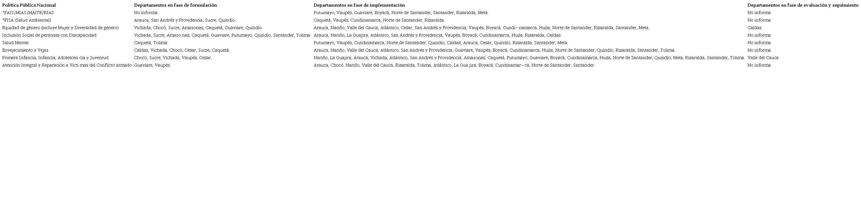 En los PDD se hace evidente el compromiso con las políticas públicas nacionales, algunos en mayor grado de avance que otros. Llama la atención que la política pública con mayor grado de avance en los departamentos analizados es la de Primera Infancia, Infancia, Adolescencia y Juventud, en contraste la de menor evidencia en el avance es la Política de Atención Integral en Salud (PAIS). En la siguiente tabla se presentan los resultados en esta categoría. (Tabla 4)