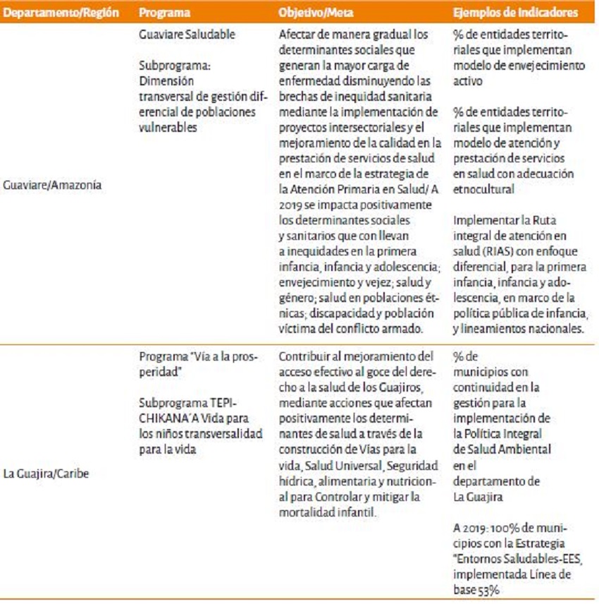 De todos los PDD revisados, se destaca el PDD del Vaupés con el análisis de salud más completo realizado con el modelo conceptual de los DSS, al presentar un análisis de mortalidad específica complementado con el análisis de desigualdad en la mortalidad maternal, infantil y en la niñez, diferenciado por determinantes intermedios (Necesidades Básicas Insatisfechas) y determinantes estructurales (etnia y área de residencia). También presenta un análisis de los determinantes intermedios de la salud con indicadores de las circunstancias materiales por subgrupos: condiciones de vida, disponibilidad de alimentos, condiciones de trabajo, factores conductuales, psicológicos y culturales y sistema sanitario; y de los determinantes estructurales de las inequidades en salud identificando el estrato socioeconómico, los ingresos, la etnia, el nivel educativo y la ocupación, la relación entre ellos y los efectos sobre la salud de la población del departamento de Vaupés. (Gobernación del Vaupés, 2016).