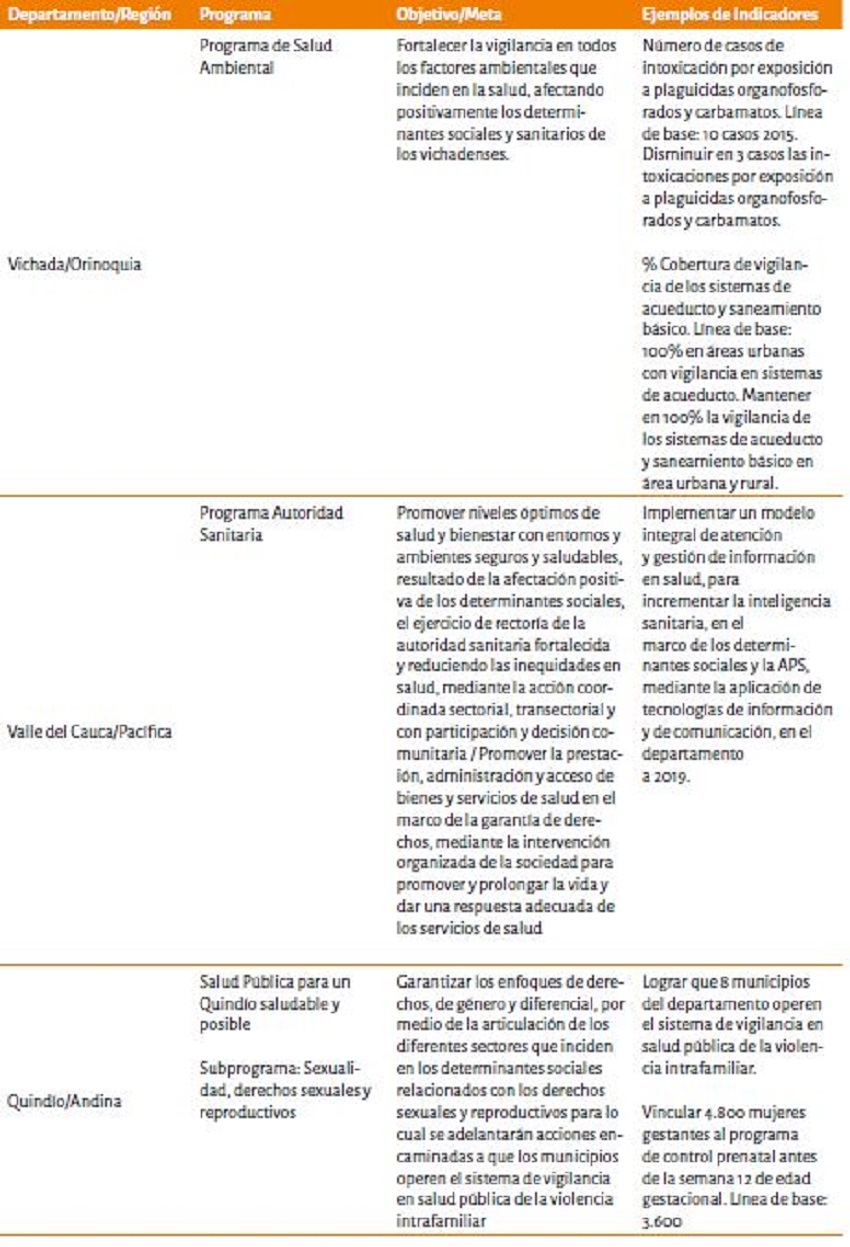 En todos los planes se encontraron programas sociales y de salud, planteados desde un abordaje integrador de los enfoques del PDSP; a partir de cada uno de los programas se establecieron propósitos, objetivos, metas e indicadores que reflejan la intencionalidad de lograr una afectación positiva y gradual de los DSS identificados en el análisis de la situación en salud, con las particularidades de cada territorio. En la siguiente tabla se presentan algunos ejemplos de estos hallazgos en esta categoría. (Tabla 3)